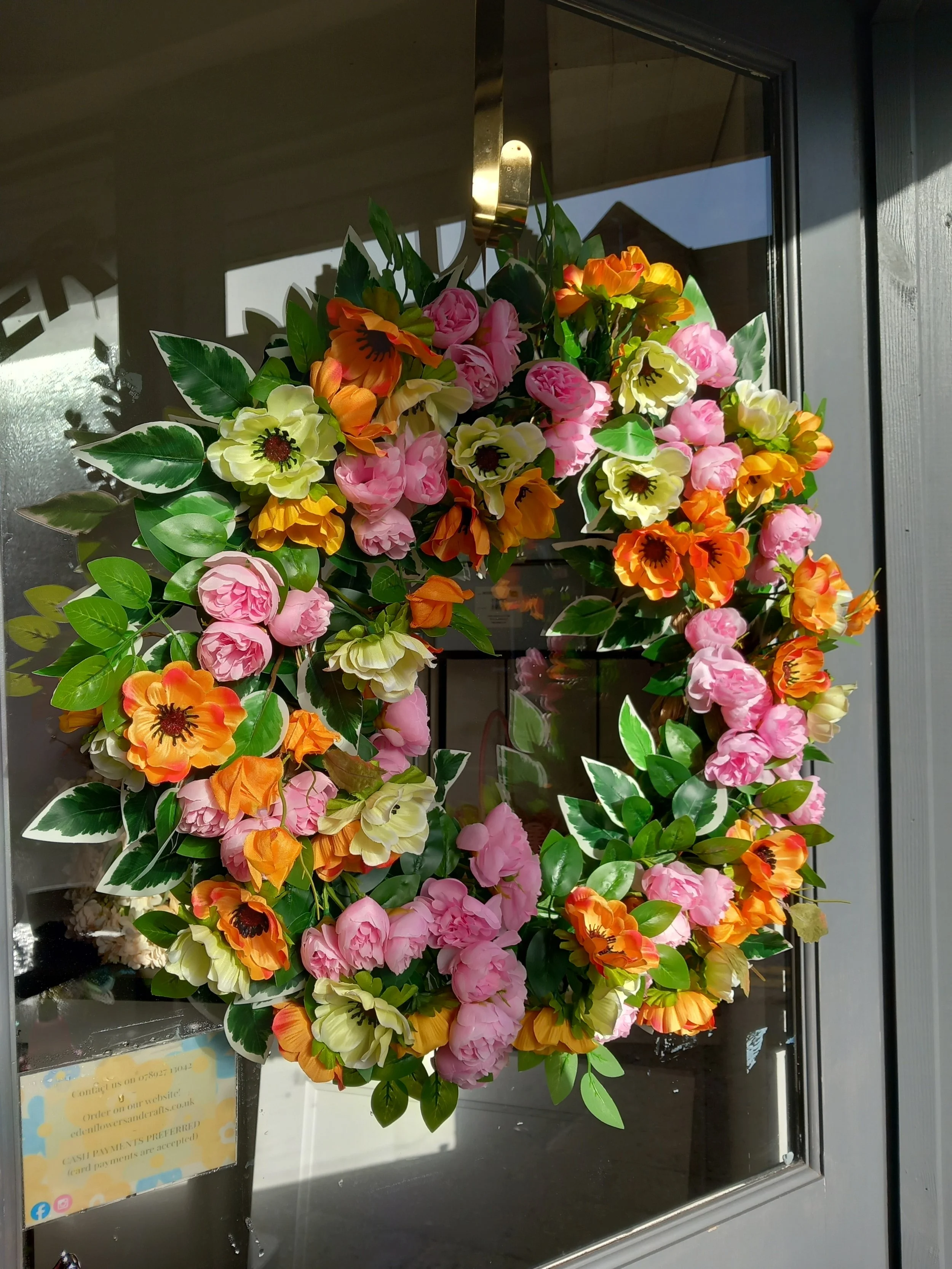 These flowers are glued onto the wreath to ensure thy do not blow off in the wind or harsh weather. For extra protection, you can spray your wreath with hairspray!