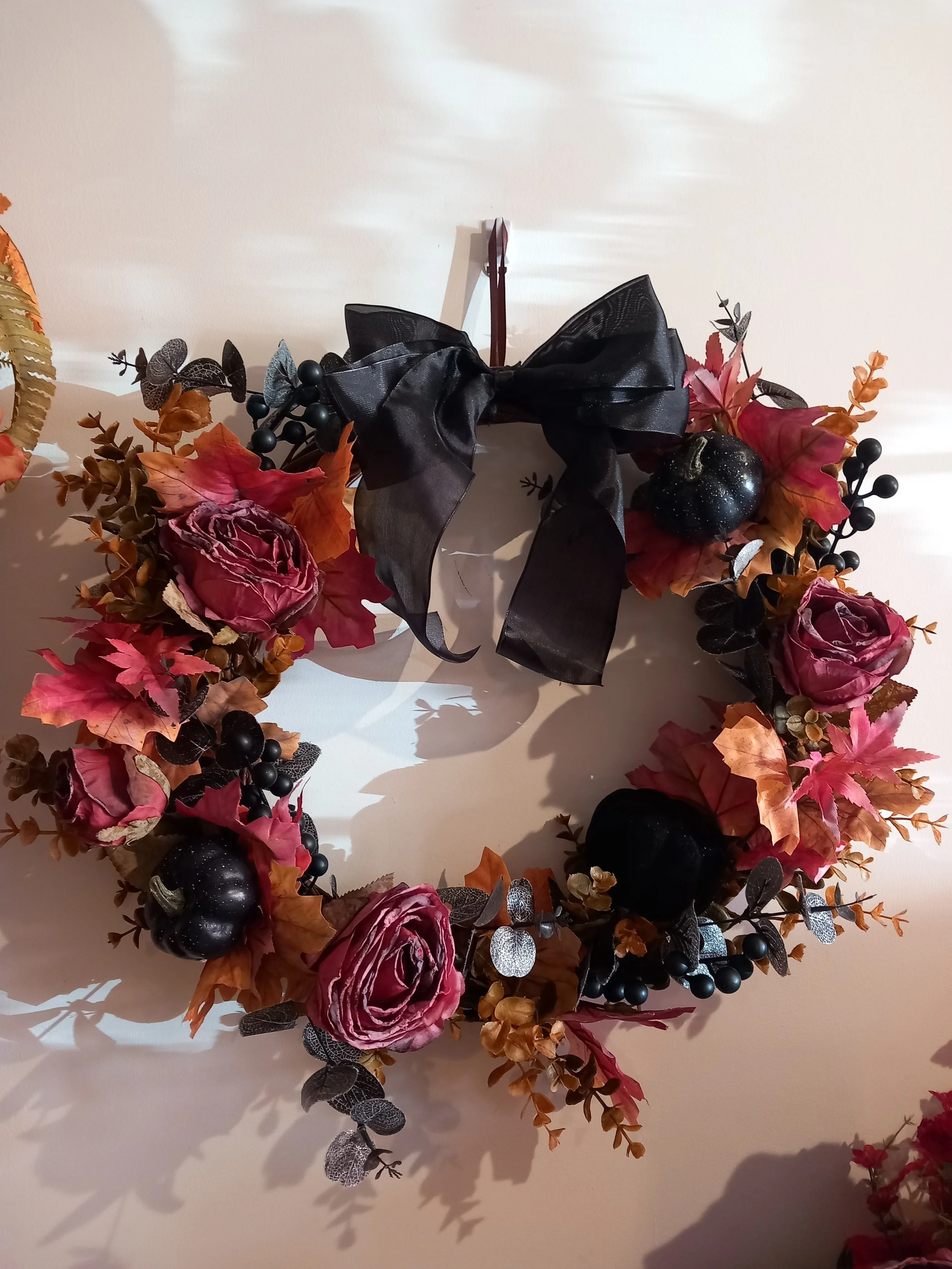 12” wreath with black eucalyptus and purple gerbera with black and white pumpkins and skeletons on a willow wreath.